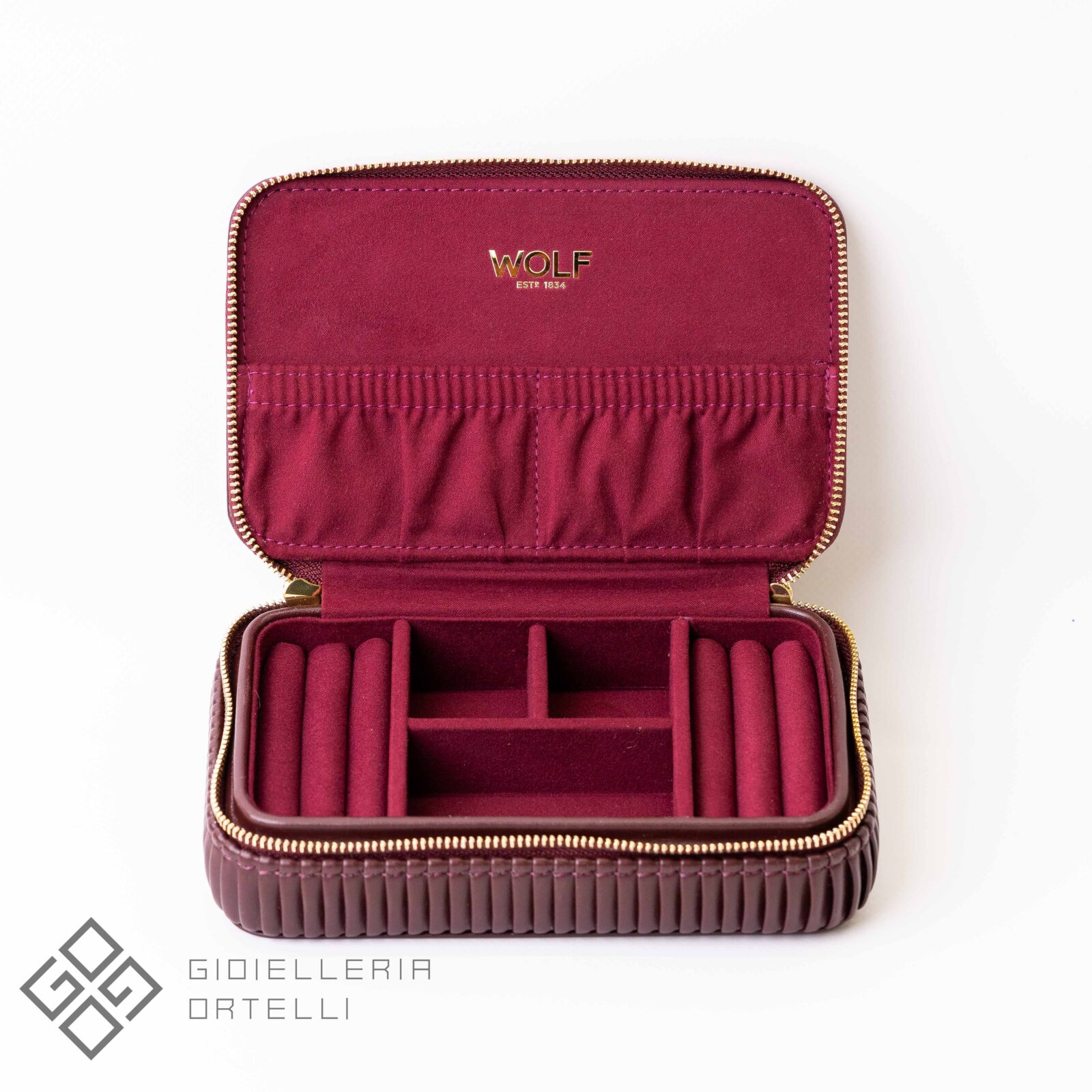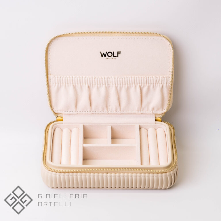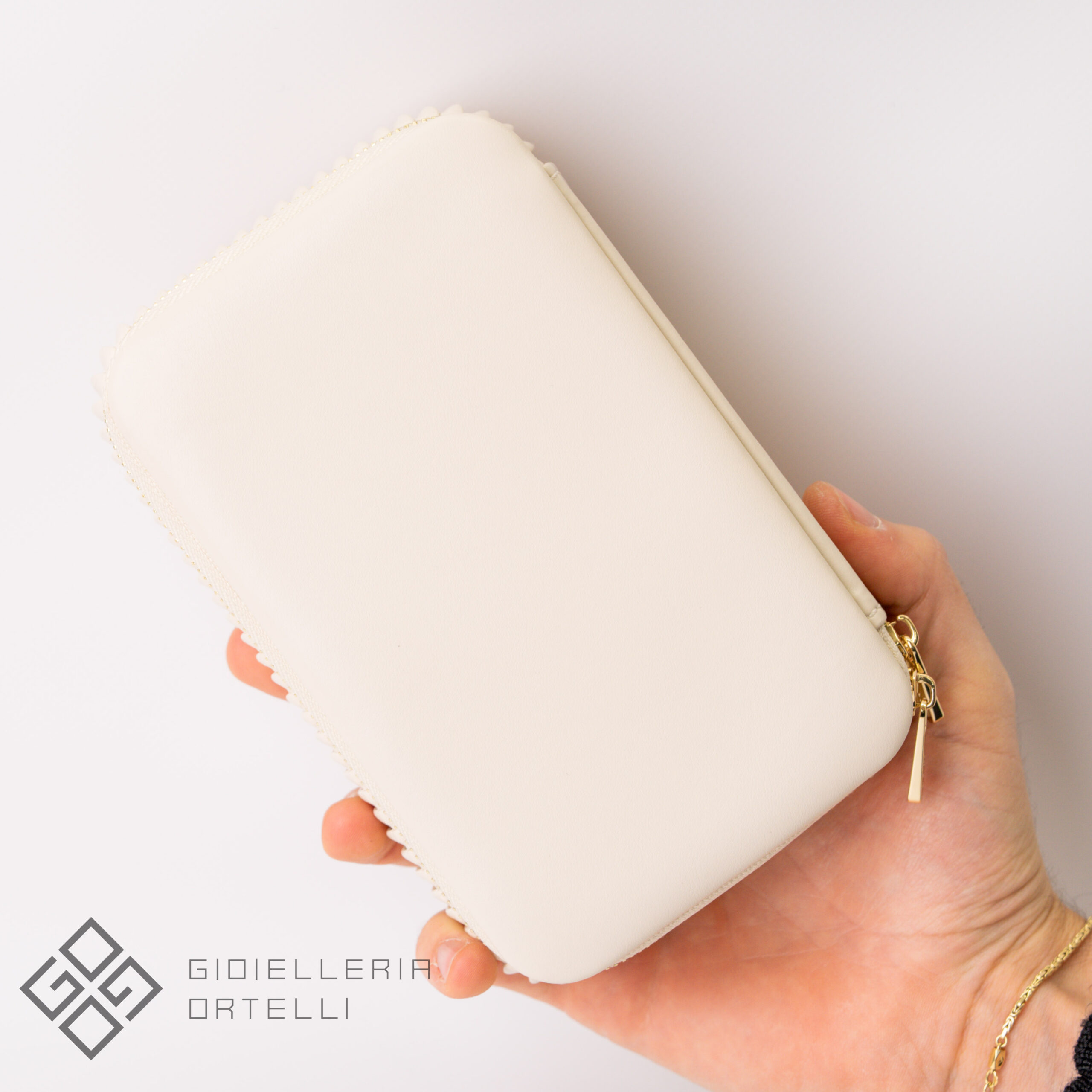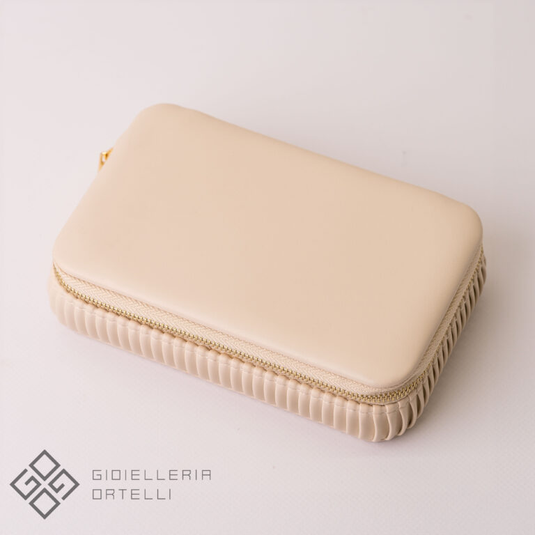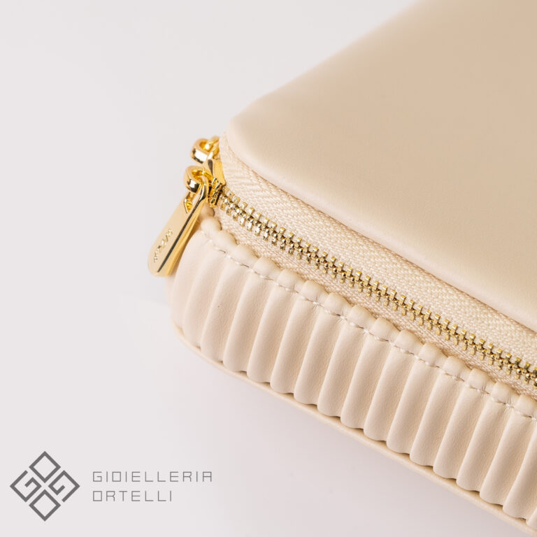 Il Portagioie Zip Bella, compatto e lussuoso, è progettato per il viaggio o per la conservazione quotidiana. L’esterno è caratterizzato da una morbida pelle vegana liscia e lati perfettamente plissettati che conferiscono un tocco di raffinatezza vintage. Le finiture metalliche color oro aggiungono un contrasto moderno ed elegante.