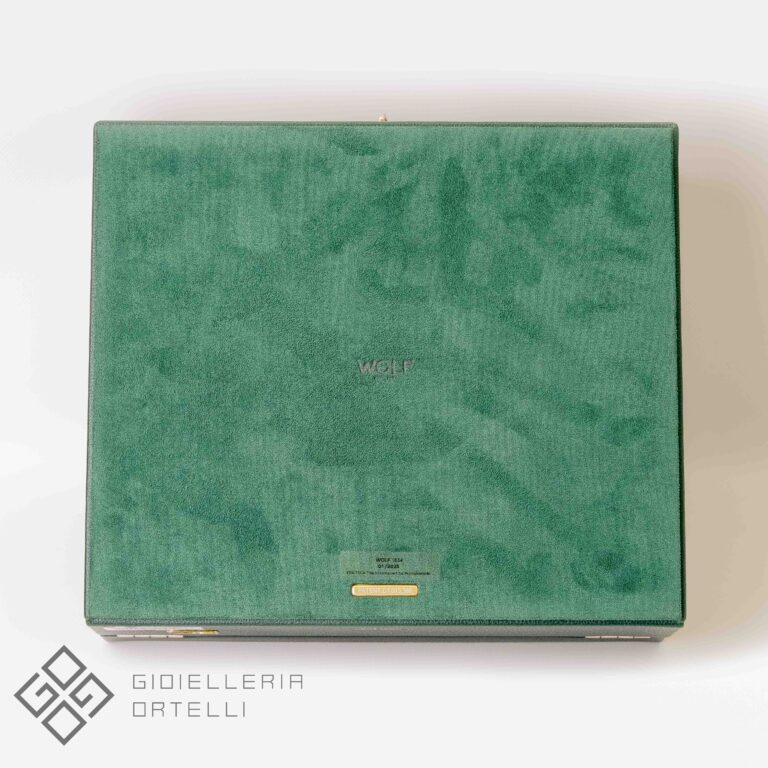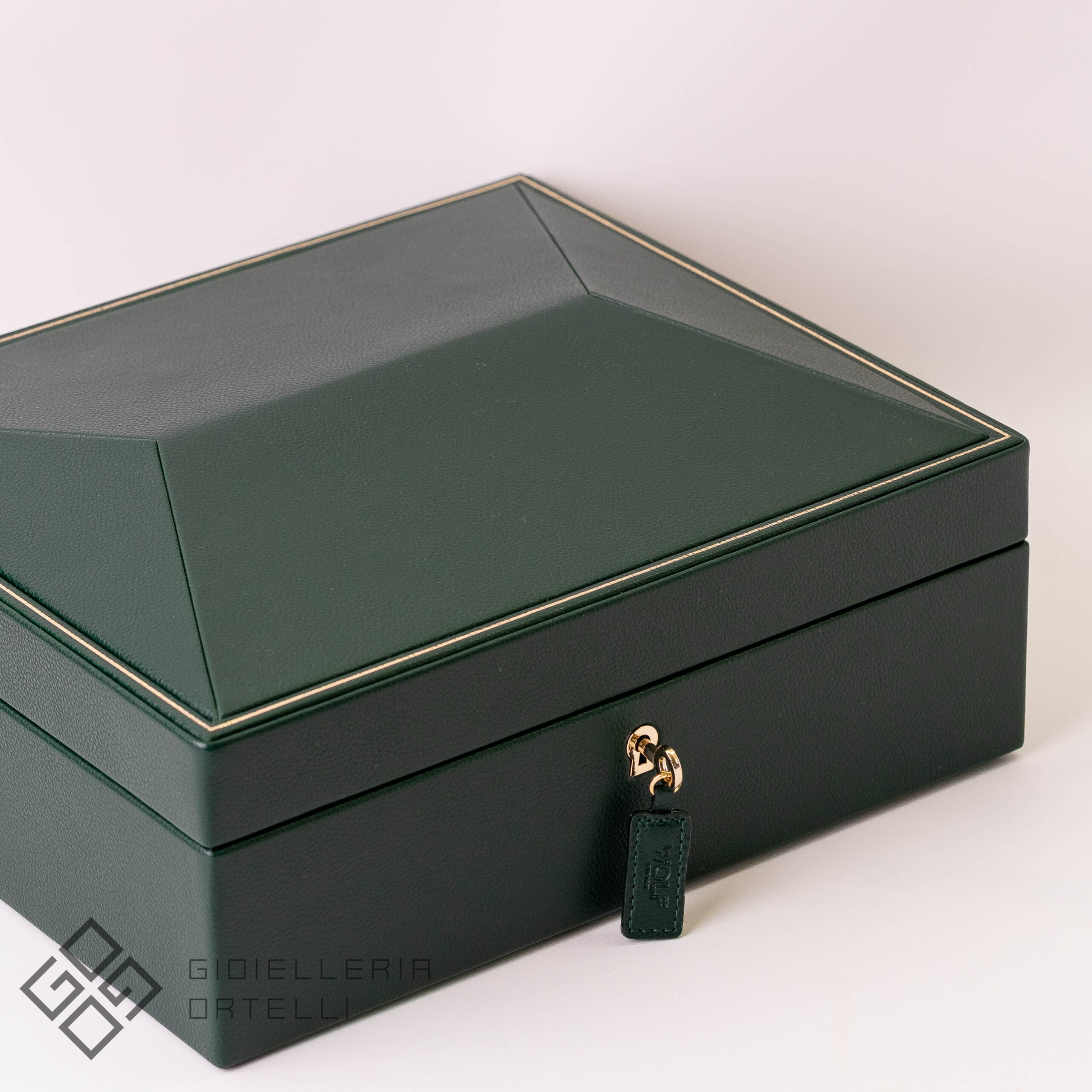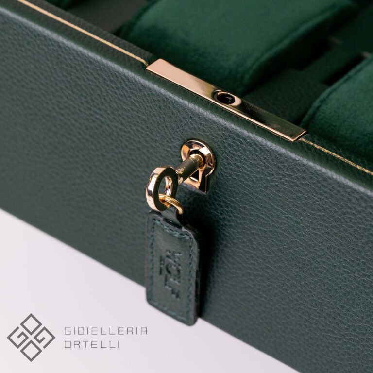 La Cassetta Porta Orologi 8 pezzi British Racing è una lussuosa vetrina statica per collezioni, ispirata al classico motorsport. Può contenere otto orologi ed è realizzata in ecopelle con finitura a grana. La cassetta include un coperchio angolato distintivo, finiture in metallo dorato e un sistema di chiusura con serratura per la massima sicurezza. Un dettaglio moderno è la presenza di una porta per cavo USB (un’apertura) nel posteriore per ricaricare gli smartwatch.