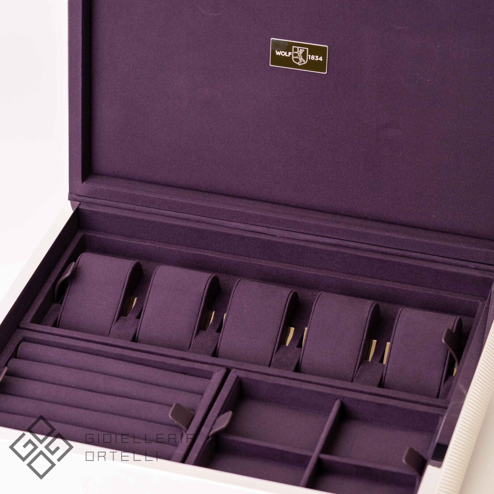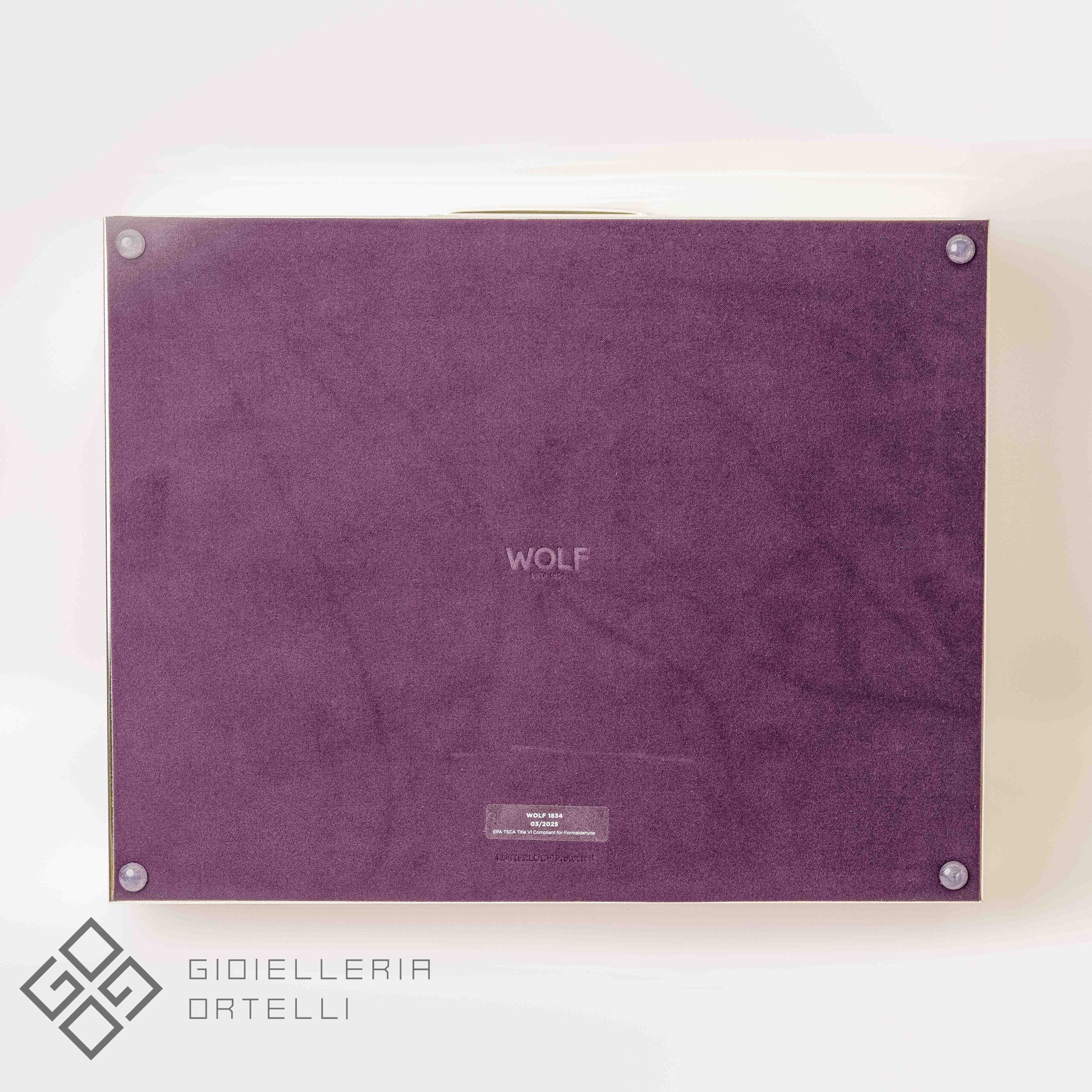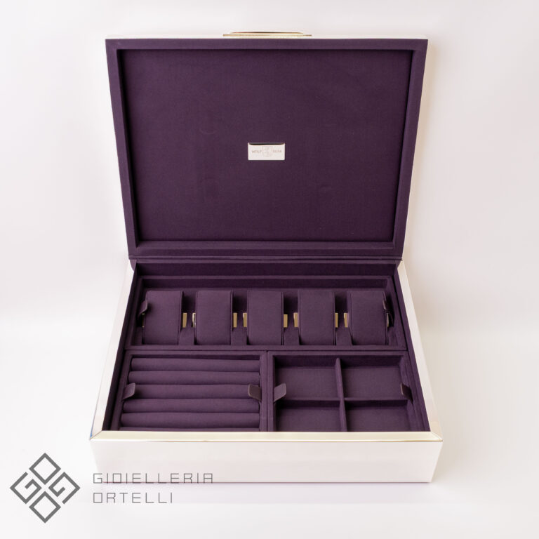 Il Cofanetto Multifunzione WOLF è ispirato alle originali scatole in argento del fondatore Philipp Wolf I. Esternamente è rivestito in argento placcato con un raffinato motivo “engine-turned” (guilloché) e presenta l’esclusivo stemma del 190° anniversario di WOLF. L’interno è rivestito in Ultrasuede LusterLoc™ che previene l’ossidazione. Offre un’organizzazione versatile con cinque cuscini per orologi e quattro vassoi rimovibili per gioielli, anelli, gemelli e altri oggetti preziosi.