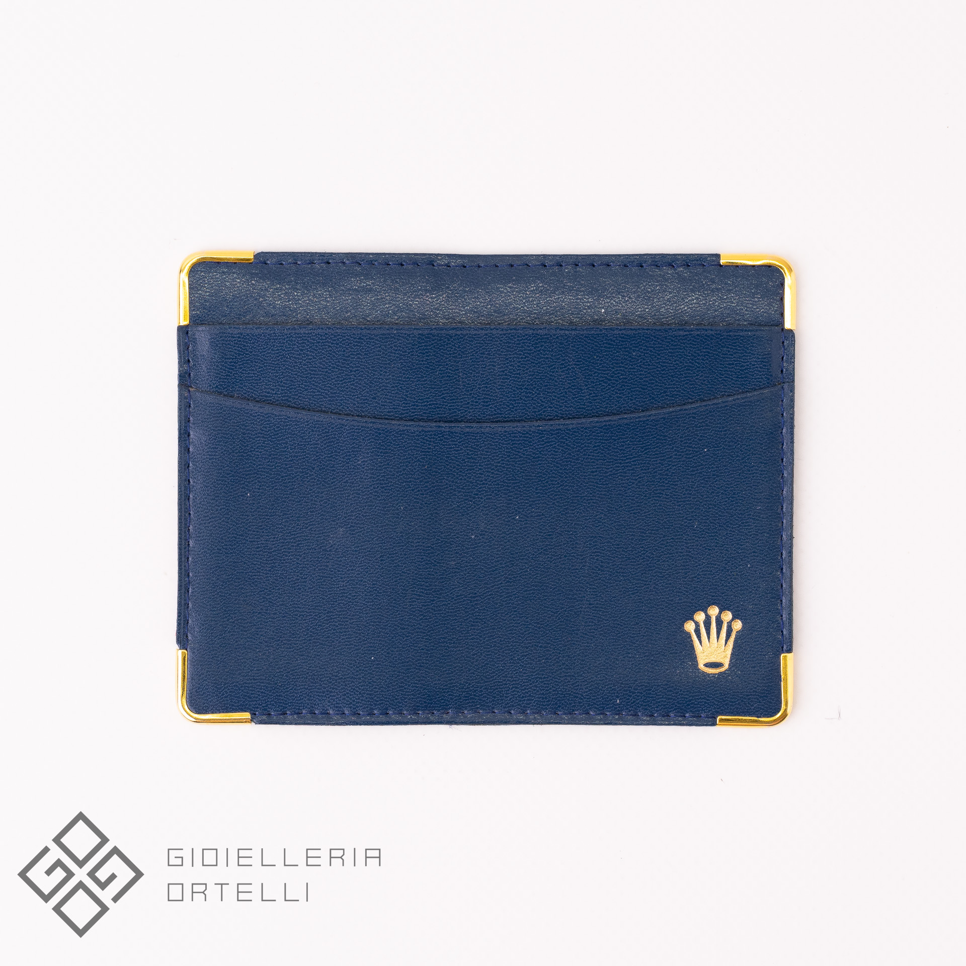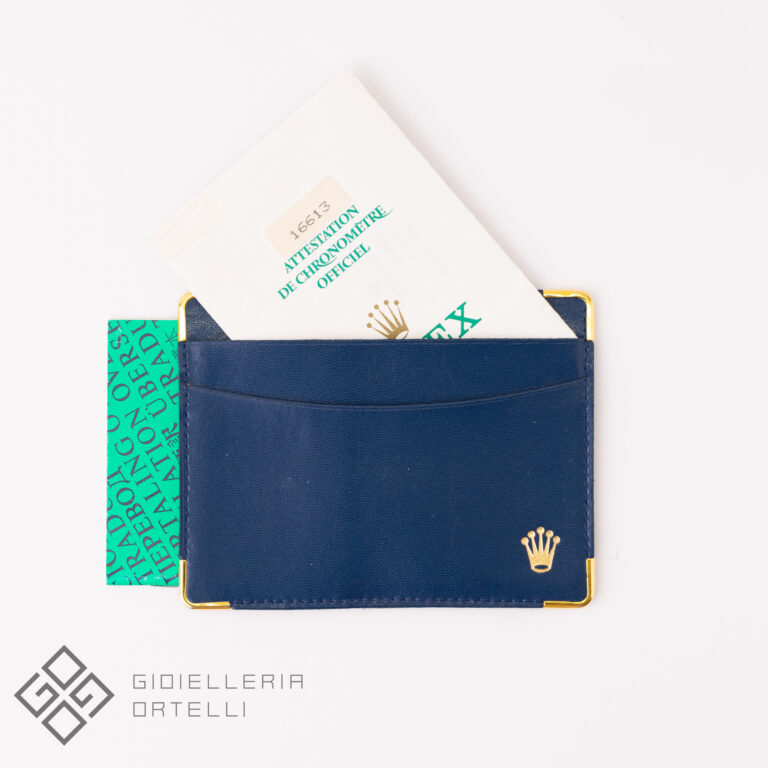 L’inconfondibile colore della pelle Blu unito agli angoli d’orati contraddistingue questo porta garanzia dedicato ai modelli Speciali Rolex durante il periodo 1980-1990.