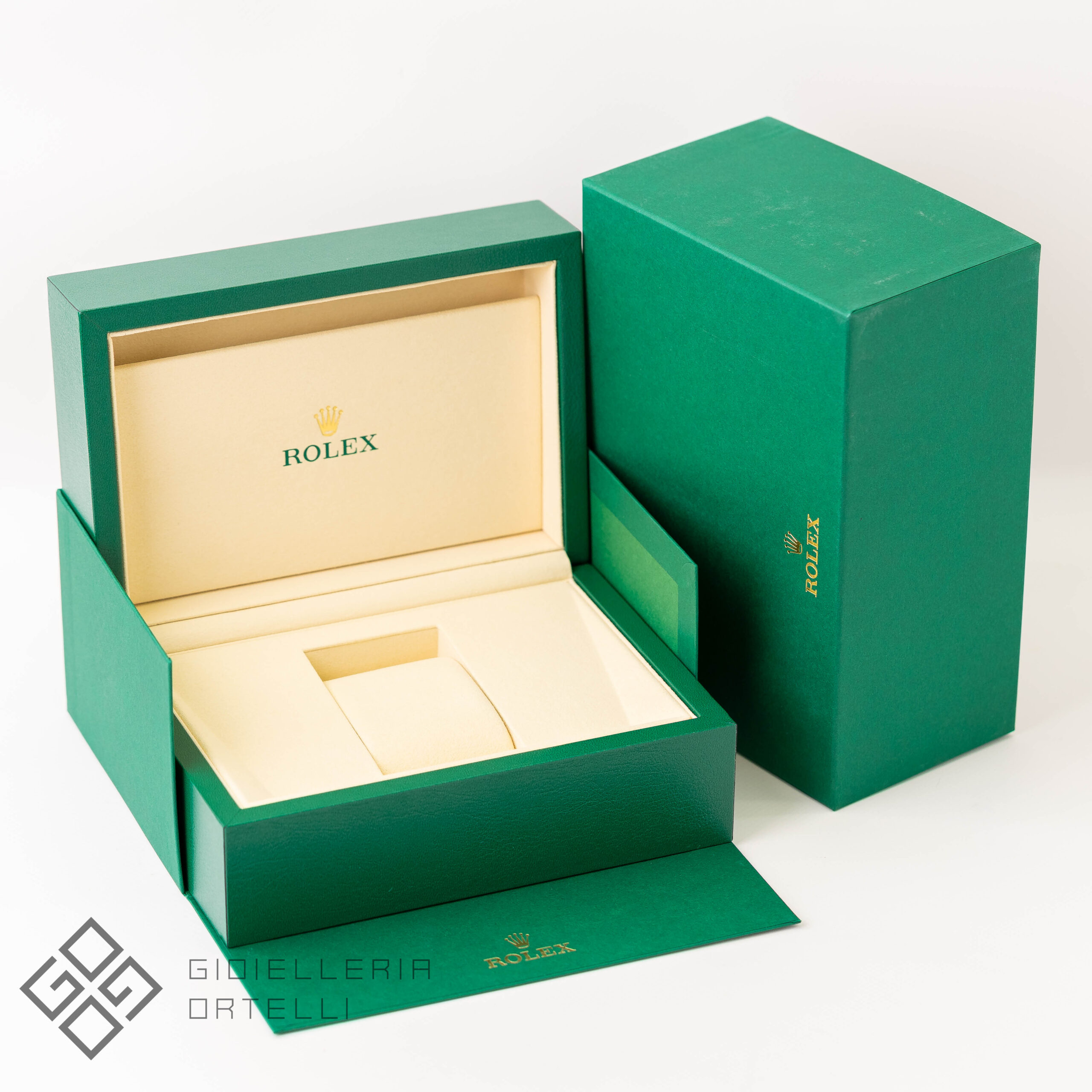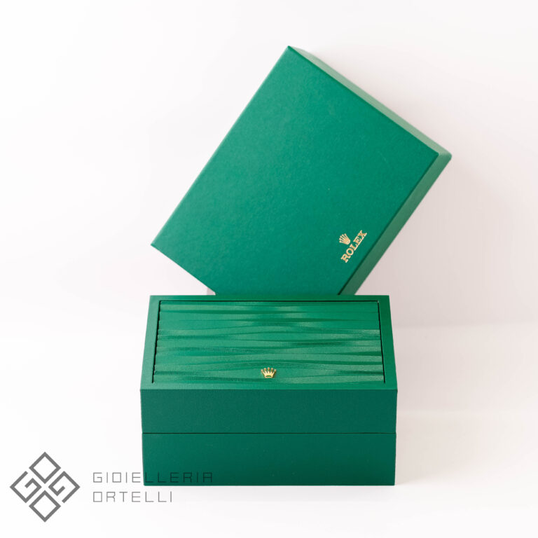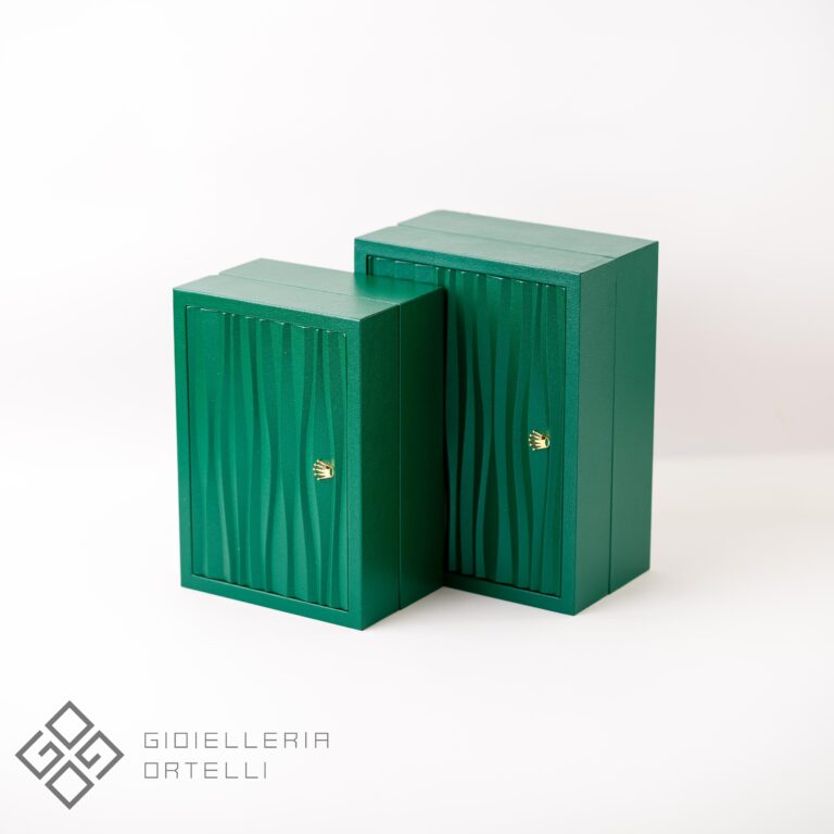 La nuova scatola Rolex si rinnova nel design e nei colori, adottando per l’esterno e la controscatola il verde ufficiale “signature” già presente su tag e accessori. Il guscio esterno è caratterizzato da un inedito motivo a onde con la corona integrata direttamente in rilievo. All’interno, la ribaltina e il nuovo cuscino offrono maggiore praticità e spazio, il tutto impreziosito da una raffinata finitura in microfibra color panna.