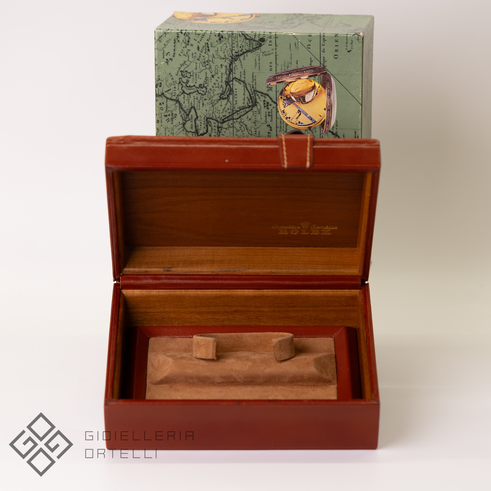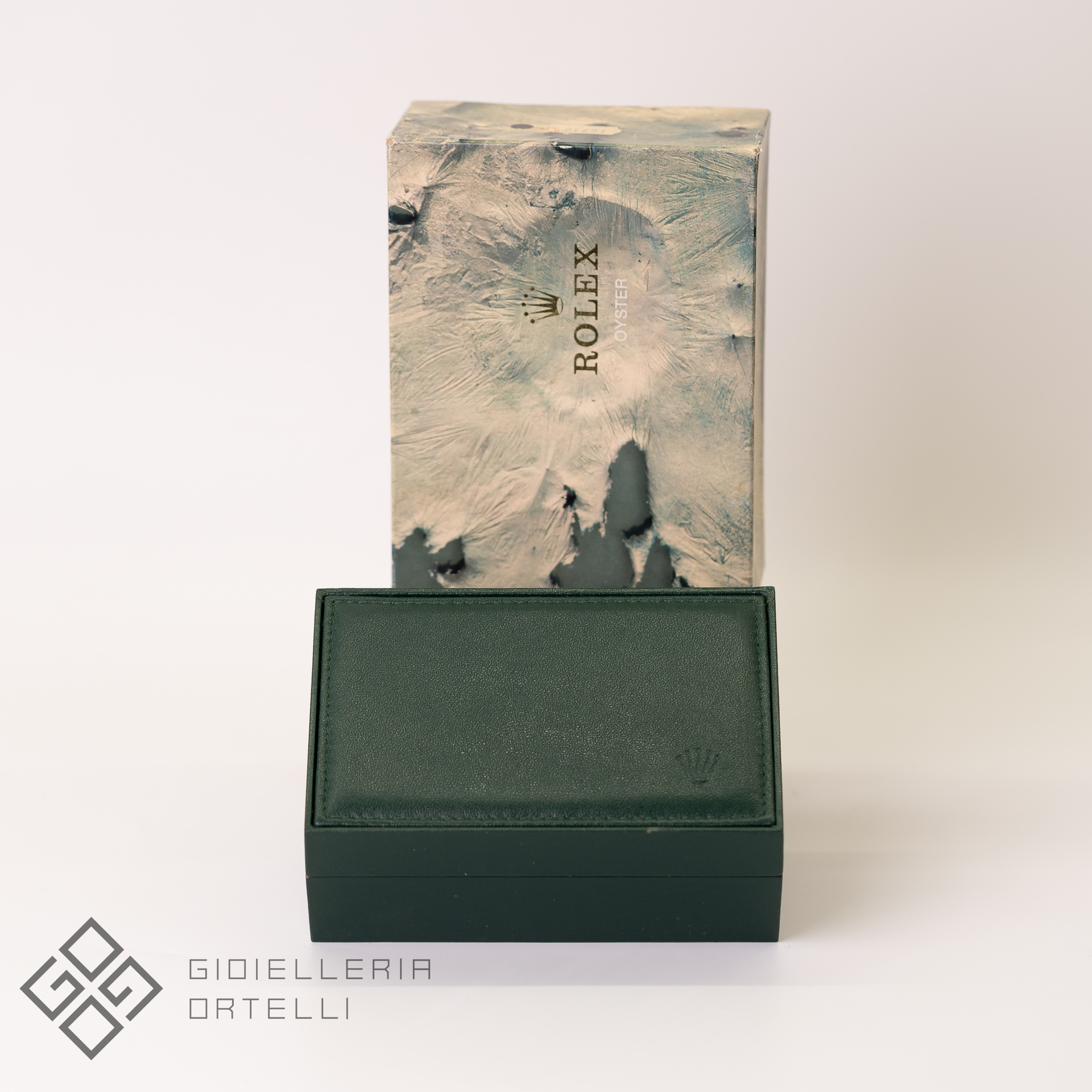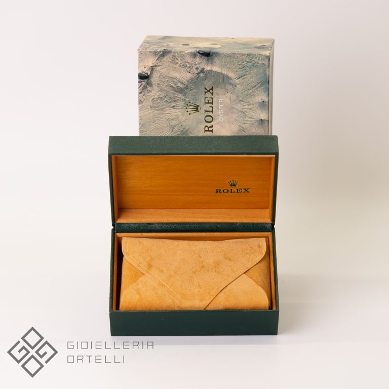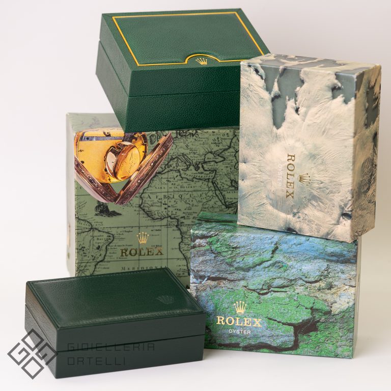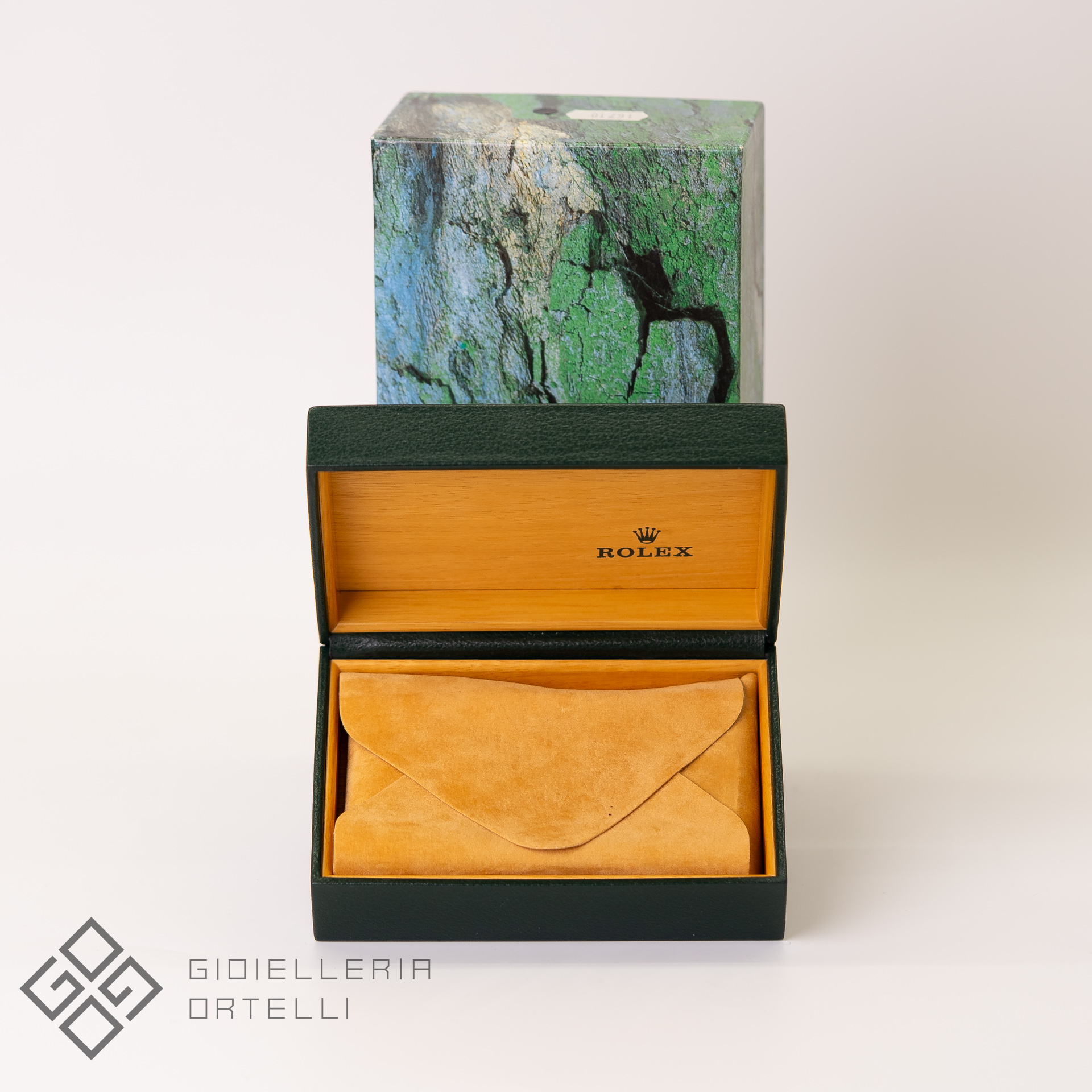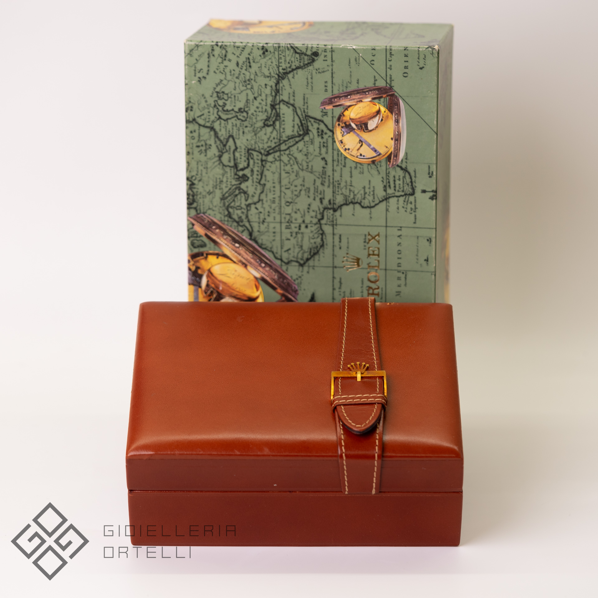 - Le Scatole Map venivano associate ai modelli Oyster Perpetual/Perpetual Date da 26 e 31mm; queste box possono essere di due tipologie (come in foto): solo pelle o pelle con bordatura dorata, entrambe abbinate alla controscatola stile mappa. Selezionando la referenza in modo accurato riceverete la scatola adatta a voi; in assenza di referenza riceverete una box casuale.
