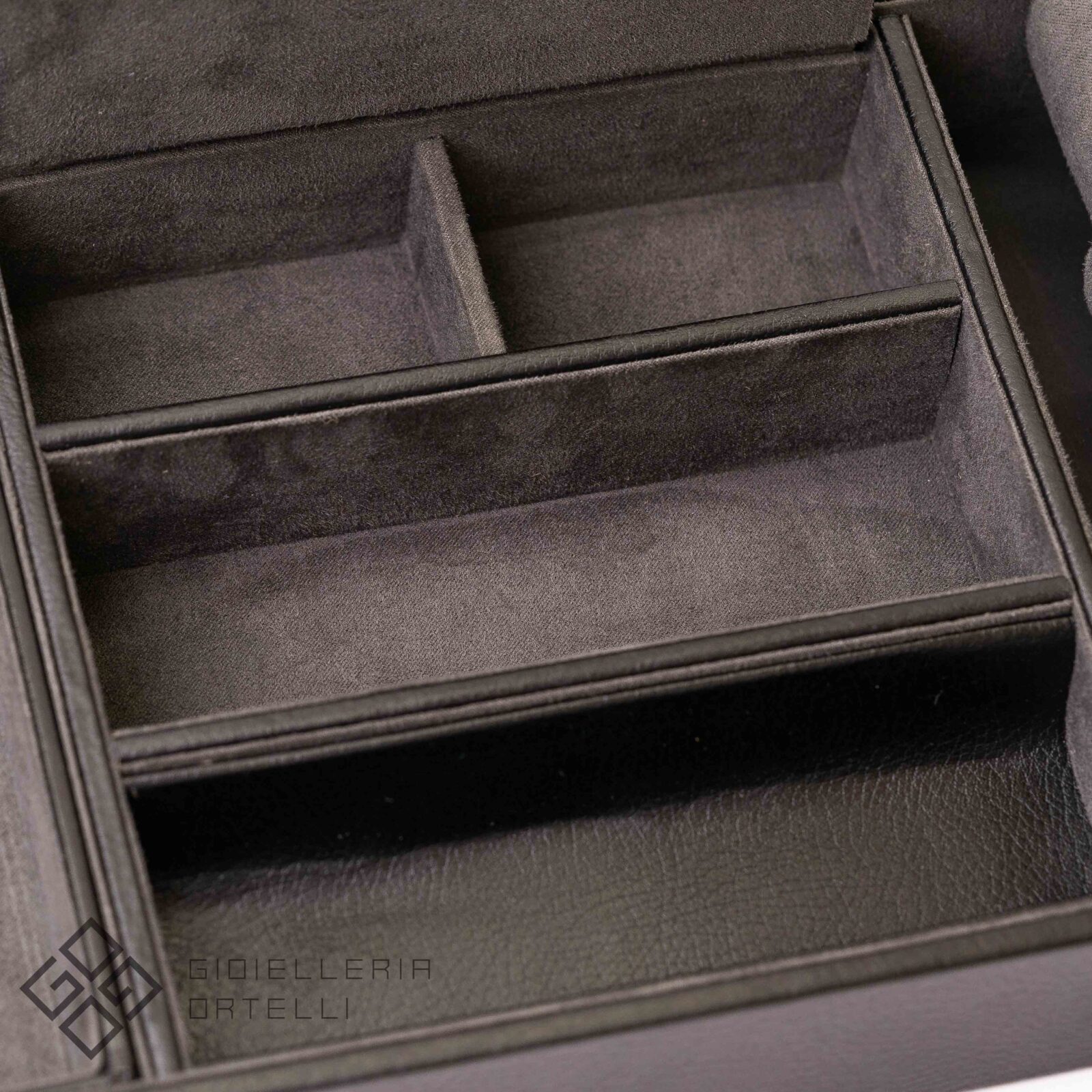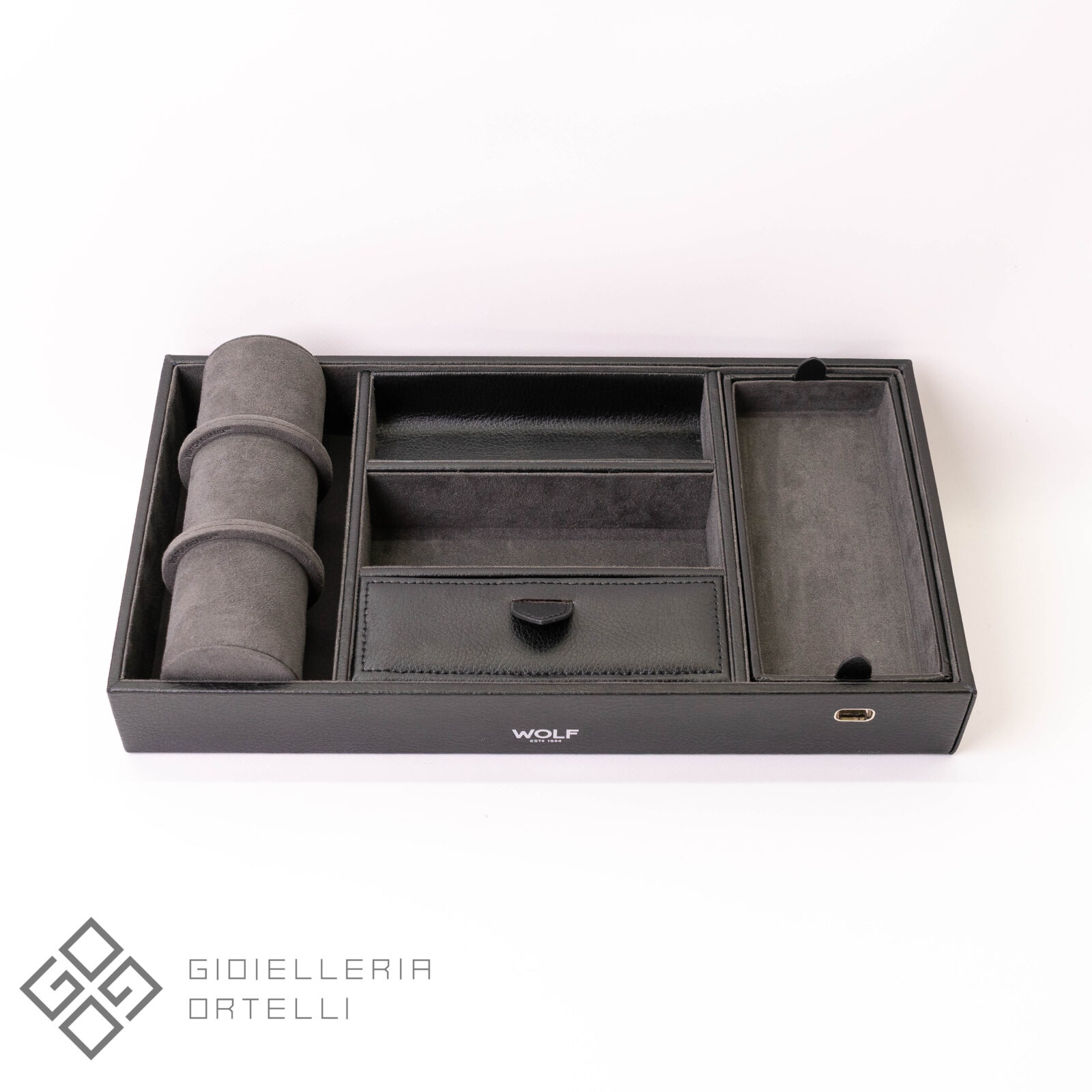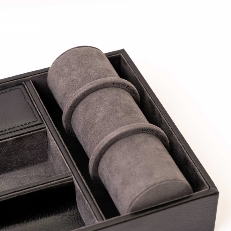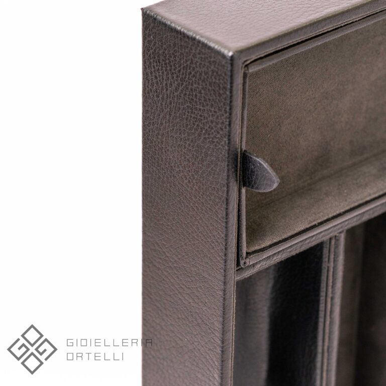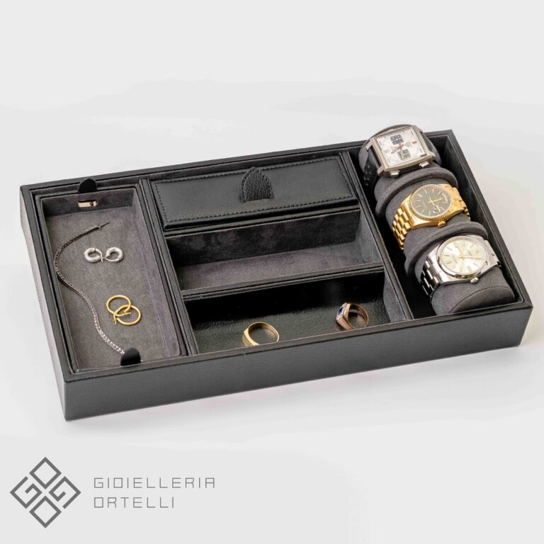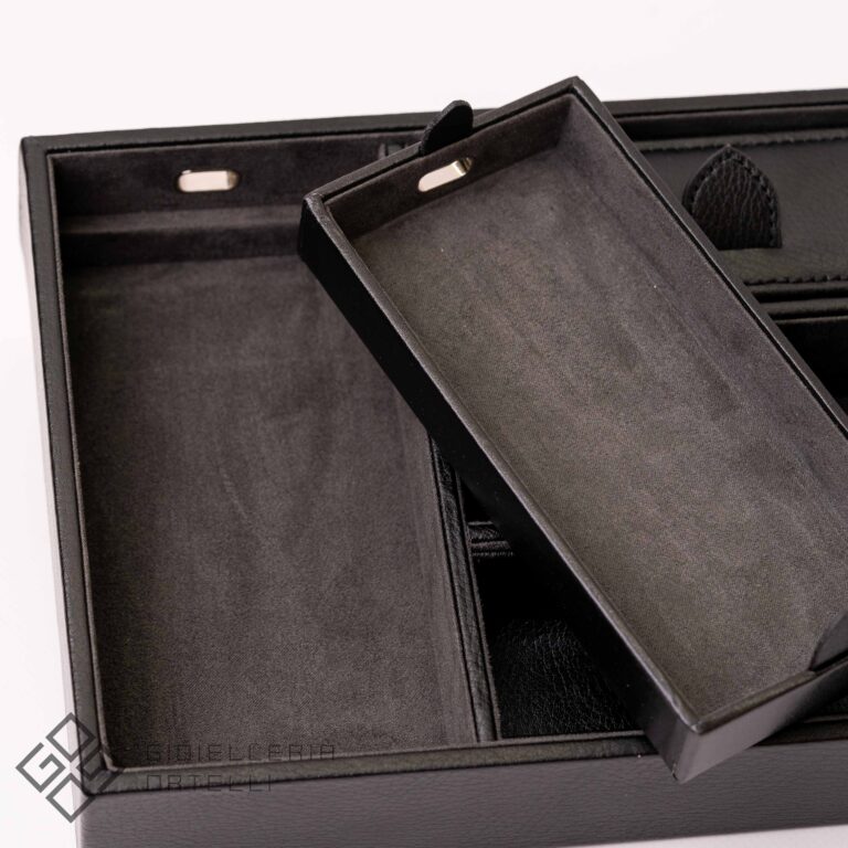 Il Vassoio Portagioie è un pratico svuotatasche di lusso che unisce stile classico e funzionalità. Esternamente è rivestito in ecopelle nera con audaci dettagli a contrasto e accenti cromati. Offre cinque scomparti per organizzare chiavi, monete, portafogli e gioielli, tra cui un vano coperto e un vassoio estraibile con un’apertura per cavi USB. La caratteristica distintiva è il lungo polsino imbottito che permette di alloggiare comodamente 3 dei vostri orologi preferiti. Perfetto per conservare i vostri preziosi all’interno di un armadio o cassaforte.